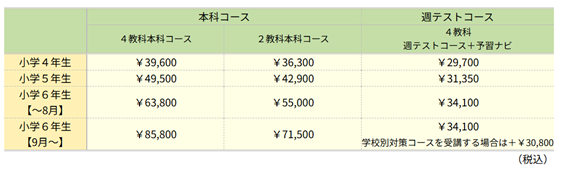 授業料・テキスト代・各種テスト代を合計しても、大手塾の中では比較的平均的な印象です。